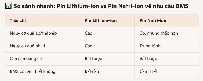 - Dù pin natri-ion được đánh giá an toàn hơn pin lithium-ion (ít cháy nổ hơn), nhưng không có nghĩa là có thể bỏ qua BMS.