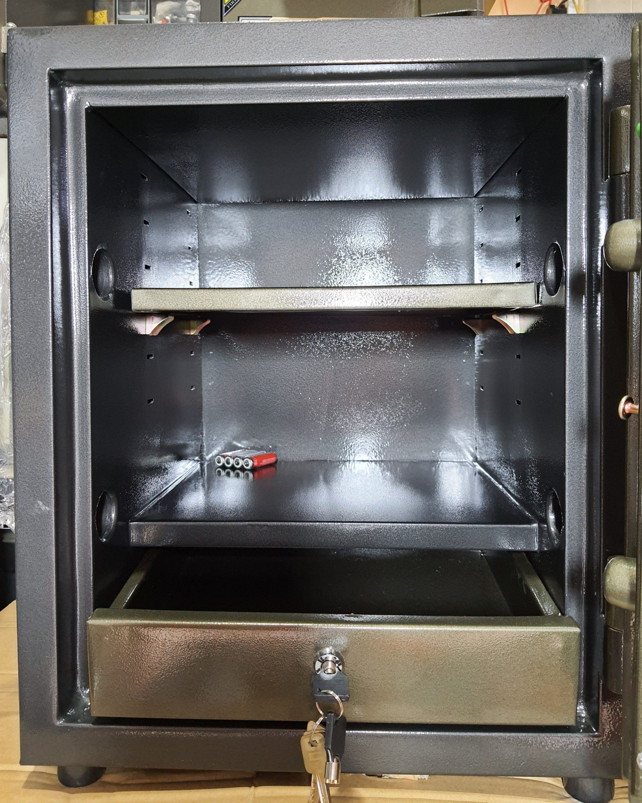 ✥ Kiểu két đứng có 1 ngăn kéo có khóa đựng nữ trang, giấy tờ ( Đựng được khổ A4 ) đặc biệt giá trị và 1 tấm ngăn tăng lên xuống theo ý quý khách
