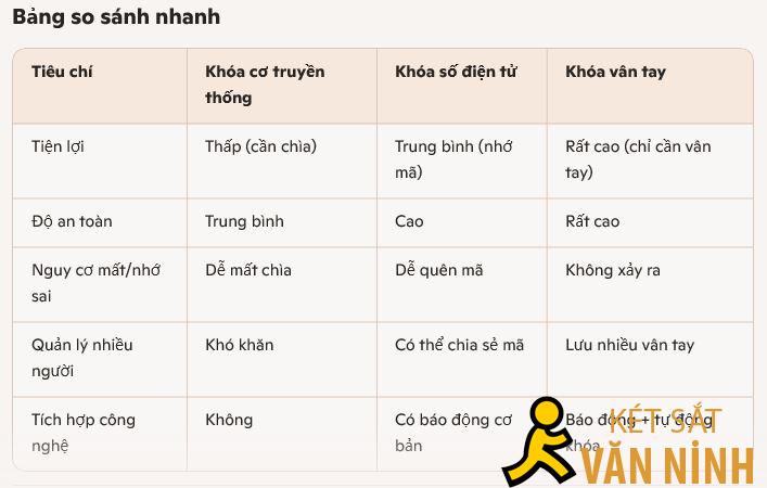 • Giảm rủi ro mất chìa hoặc quên mật khẩu:: Với khóa cơ hoặc khóa số truyền thống, người dùng có thể gặp rắc rối khi mất chìa hoặc quên mã. Khóa vân tay khắc phục hoàn toàn vấn đề này, vì dấu vân tay luôn “đi cùng” chủ sở hữu.